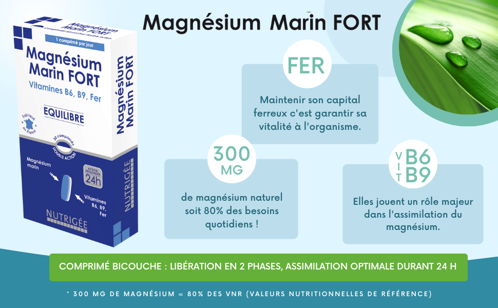 Formulé à base de 300 mg de magnésium marin, de vitamine B6, de fer et de vitamine B9, il contribue à réduire la fatigue, à renforcer la concentration et à préserver votre équilibre nerveux et musculaire.