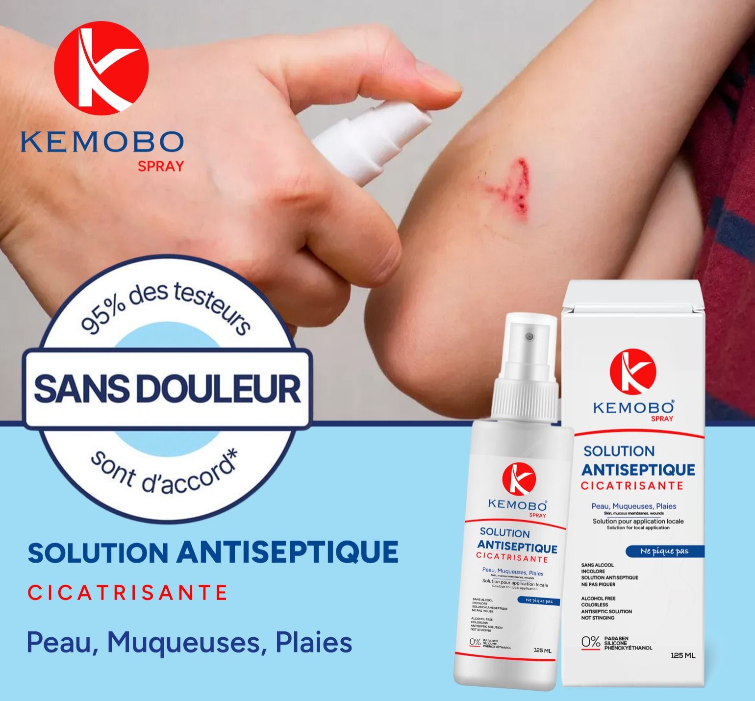 KEMOBO Spray Antiseptique et Cicatrisant est un soin cutané complet conçu pour désinfecter, protéger et accélérer la cicatrisation des plaies superficielles, éraflures, coupures ou irritations.